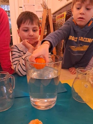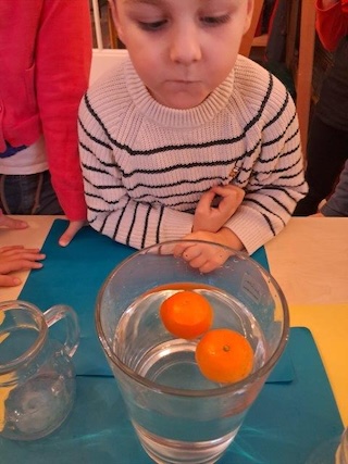 Die geschälte Mandarine sinkt aufgrund ihrer geringeren Dichte ab.
