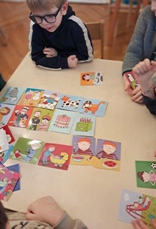 Handlungsbegleitendes Sprechen und aktives Zuhören erweitern den Wortschatz und fördern den Dialog.