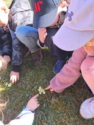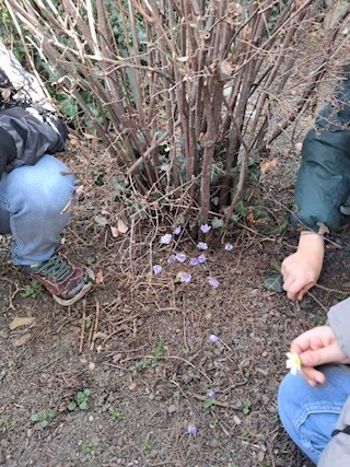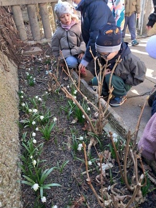 Wir spazieren aufmerksam durch unseren Garten und entdecken die ersten Primeln, Veilchen, Leberblümchen und Frühlingsknotenblumen.