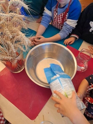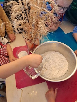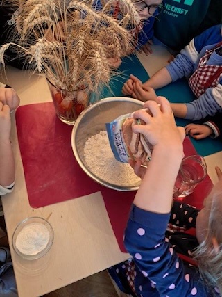 Die Kinder erleben wie Brot gebacken wird und lernen den Weg vom Korn auf dem Feld bis zum fertigen Brot genauer kennen.