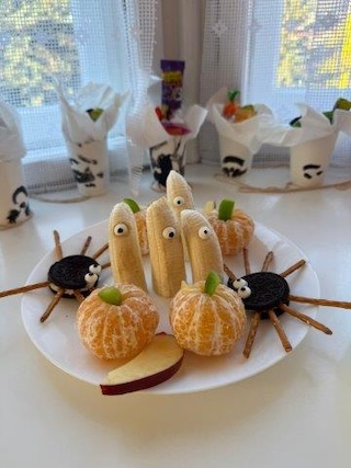 Bei festlich gedeckter Tafel genießen wir unsere Bananen Geister, Mandarinen Kürbisse und süßen Spinnen.