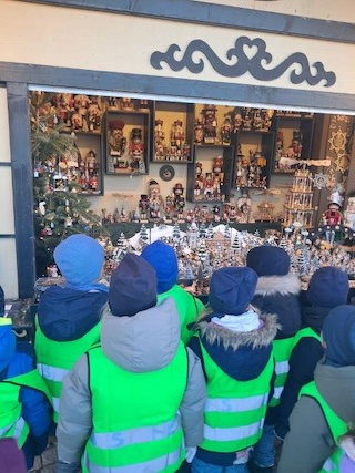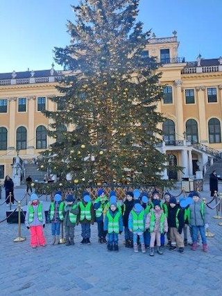 Wir besuchen den Weihnachtsmarkt in Schönbrunn bei Sonnenschein und tiefblauem Himmel.