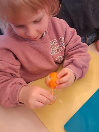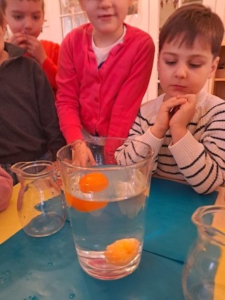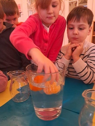 Die geschälte Mandarine sinkt aufgrund ihrer geringeren Dichte ab.